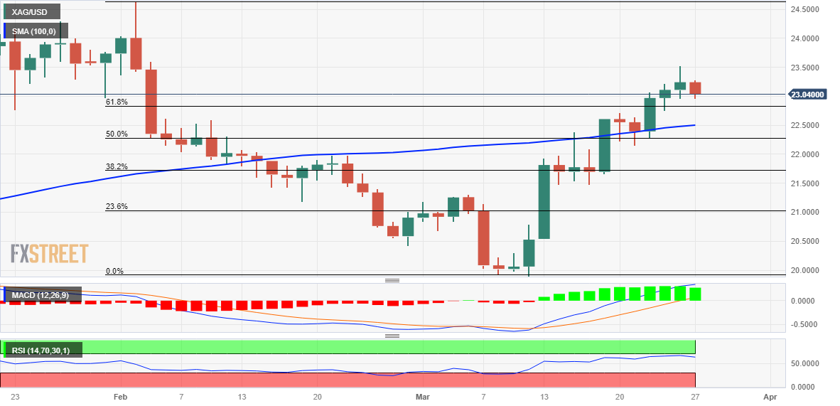 On the flip side, the daily swing high, around the $23.25 area, now seems to act as an immediate hurdle ahead of the mid-$23.00s, or the multi-week top set on Friday. A sustained move beyond should pave the way for additional gains and allow the XAG/USD to aim to reclaim the $24.00 round figure. The momentum could get extended towards testing the multi-month peak, around the $24.65 region touched in February, en route to the $25.00 psychological mark.