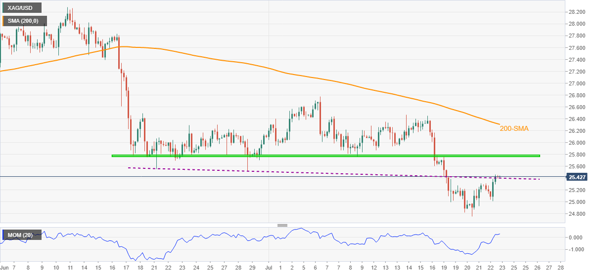 Silver (XAG/USD) prices struggle to extend the two-day advances beyond $25.50 during early Friday. That said, the bright metal eases to $25.28, down 0.18% on a day by the press time.