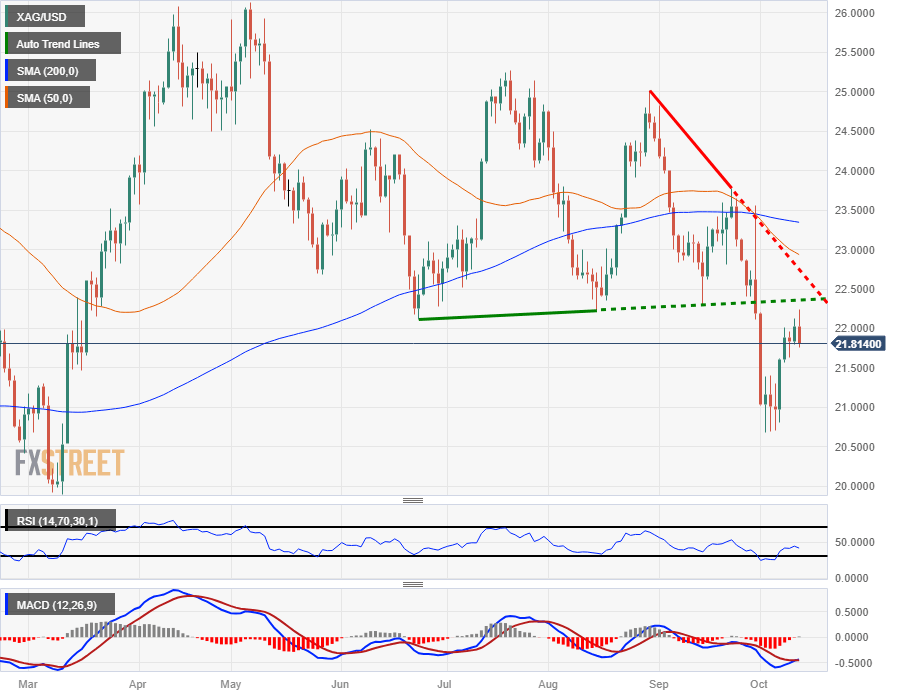 XAG/USD remains steeply off the year's highs of $26.14, and remains in the red from 2023's opening bids of $24.00. The last swing high on the daily candlesticks into $23.75 saw Silver shed the 200-day SMA and mark in a low of $20.68 for the year.