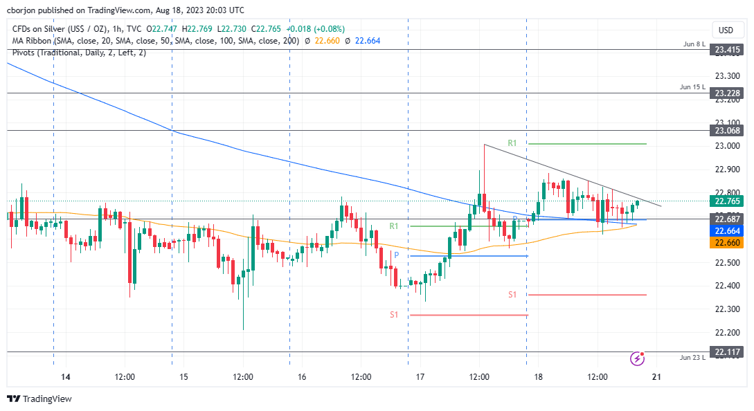 From an intraday perspective, the XAG/USD remains trading sideways, slightly tilted upwards, with upside risks remaining, as XAG/USD is testing a downslope resistance trendline. A breach of the latter will expose the $22.80 price level, followed by the confluence of the weekly high and Friday’s R1 daily pivot at around $23.00 per ounce.