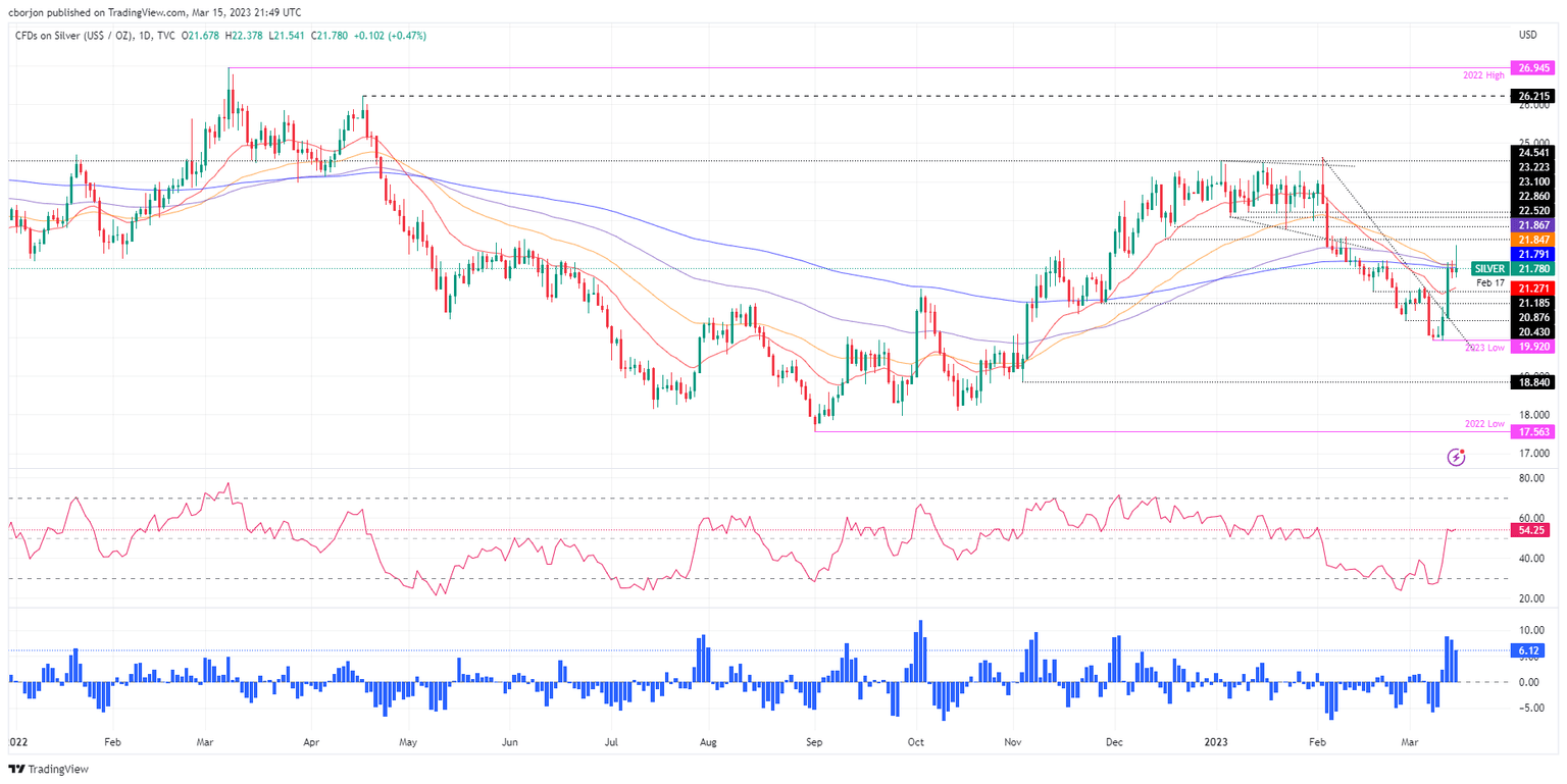 After reaching a daily high, the XAG/USD retreated from levels around $22.30s and cleared the confluence of the 50, 100, and 200-day EMAs at around $21.79-86. Therefore, the bearish bias remains intact, as the XAG/USD is set to achieve a daily close below the 200-day EMA.