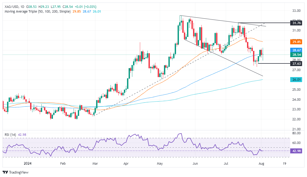 - Bearish scenario if XAG/USD falls below $28.00, targeting $27.95, July 29 low ($27.31), and 200-DMA ($26.00).