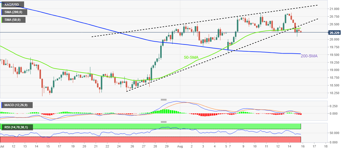 Silver price (XAG/USD) holds lower ground near $20.20 after confirming a bearish formation, namely a rising wedge, the previous day. That said, the bright metal’s pullback from the 50-SMA and the downbeat oscillators also favor the sellers during Tuesday’s Asian session.
