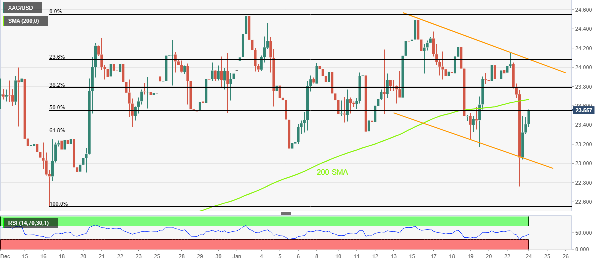 As the XAG/USD recovery takes clues from the RSI (14) rebound from the overbought territory, the latest run-up is likely to poke the immediate hurdle, namely the 200-SMA level surrounding $23.65.