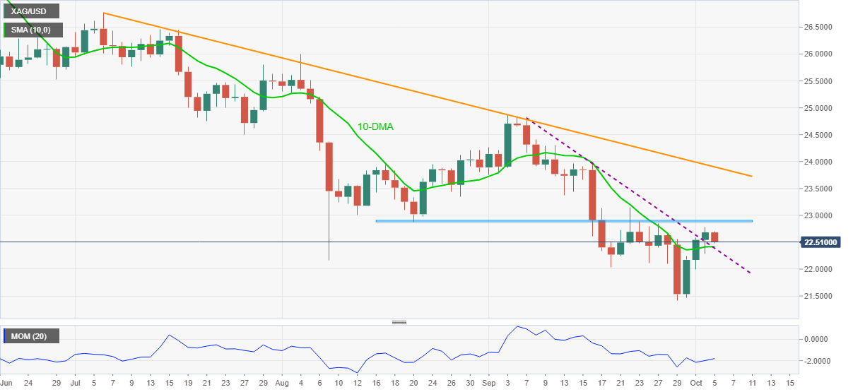 Although failures to cross a six-week-old horizontal hurdle keeps XAG/USD sellers hopeful, a convergence of the 10-DMA and previous resistance line from early September, near $22.40, challenges the quote’s immediate declines.