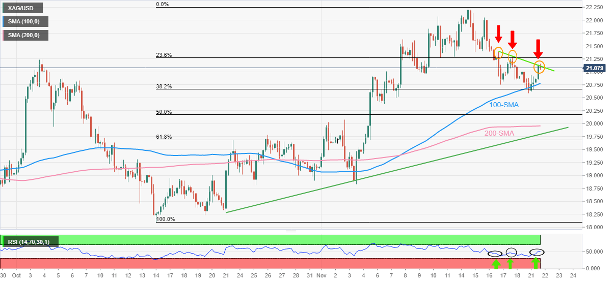 Alternatively, sustained trading beyond the aforementioned resistance line, close to $21.15 at the latest, could tease the XAG/USD buyers.