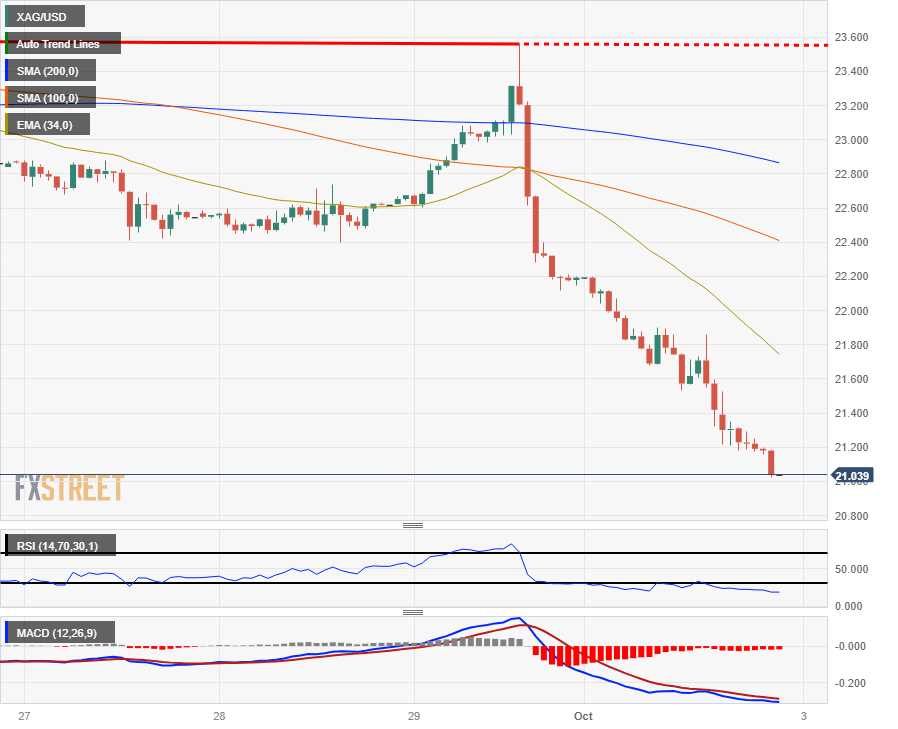 Hourly candles show Silver essentially in freefall in the near-term, with the XAG/USD down over 11% from Friday's peak at $23.56, and intraday action has pulled the bids far away from the 200-hour Simple Moving Average (SMA) currently turning bearish into $22.80.
