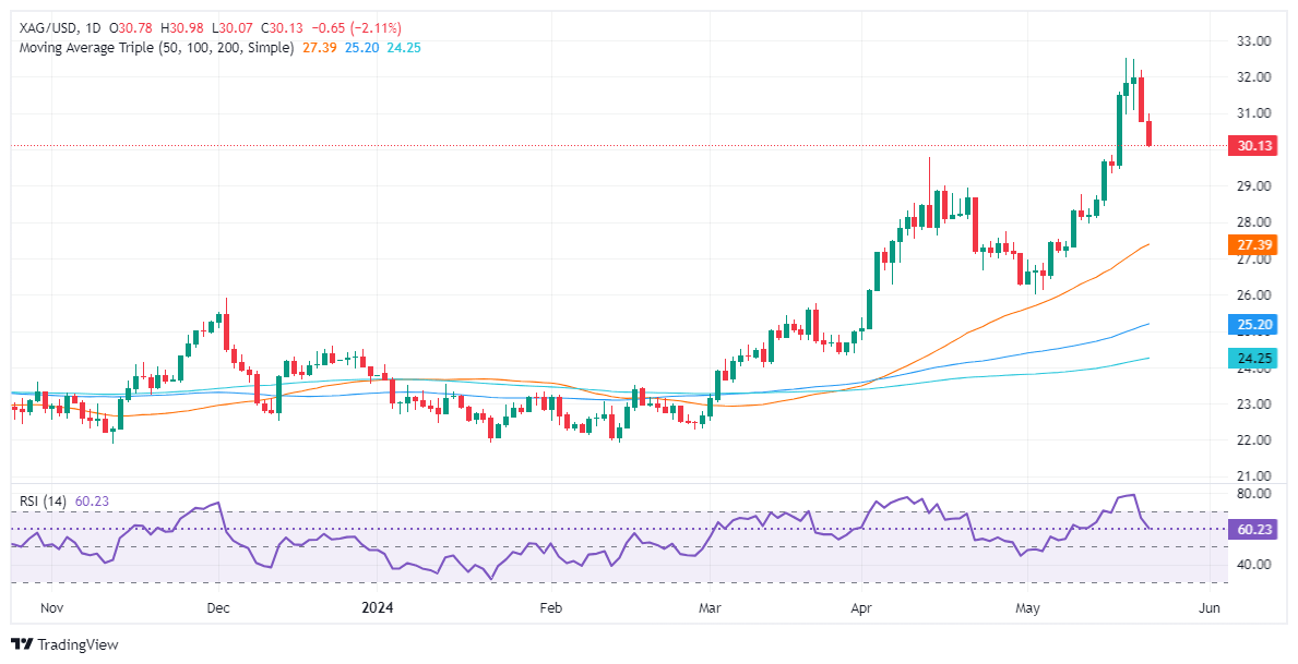 Silver price tumbled more than 2% on Thursday as economic data from the United States showed that business activity is faring well amid a high interest rates economy. At the time of writing, the XAG/USD trades at $30.10, down 2.18%.