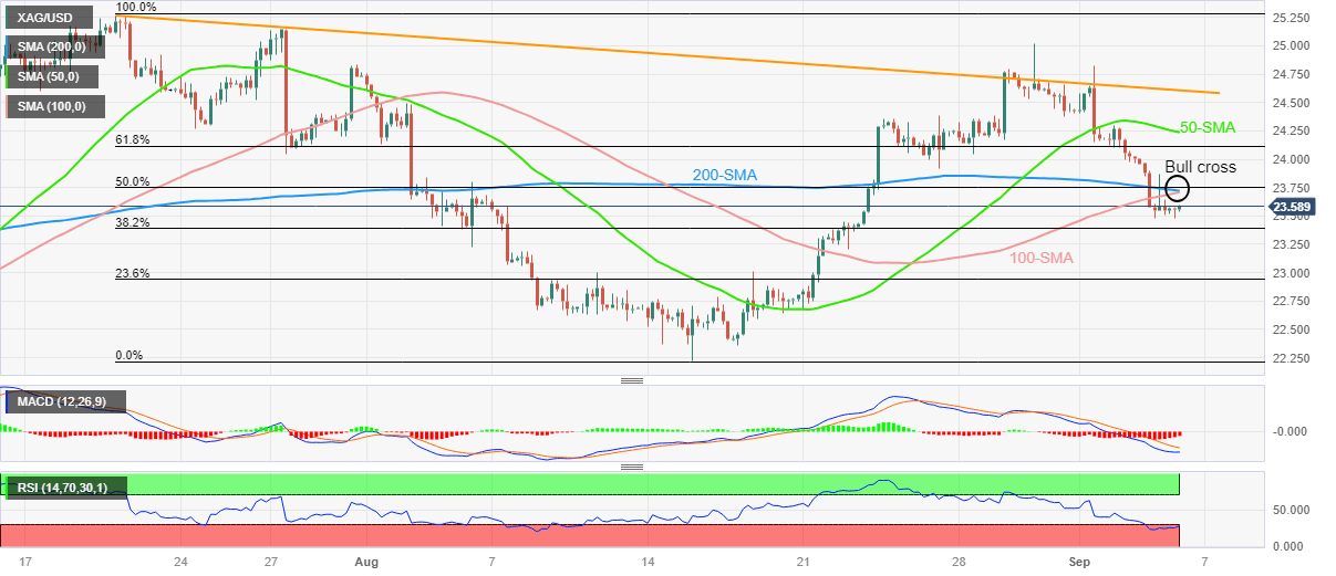 Silver Price Analysis: XAG/USD prints corrective bounce near $23.50, focus on Bull Cross