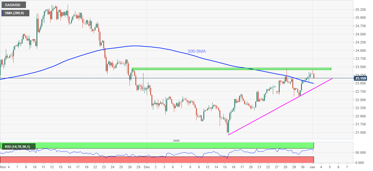 Silver begins 2022 with mild losses of around 0.50% intraday while stepping back from the weekly top towards $23.00 during early Monday.