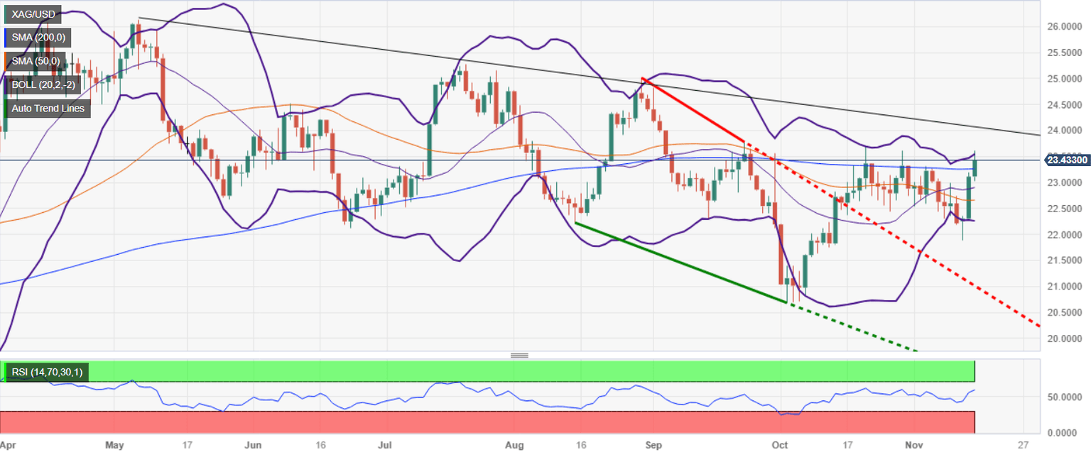 Silver price climbs on Wednesday, following last Tuesday’s soft US inflation report, which sent US Treasury bond yields plummeting on expectations the US Federal Reserve is done hiking rates. Hence, the XAG/USD advances sharply, reaching key resistance levels like the 200-day moving average (DMA) at $23.26. If Silver bulls hold price above the latter, the uptrend would likely continue toward year’s end, as buyers target $24.00. The XAG/USD is trading at $23.40, up 1.47%.
