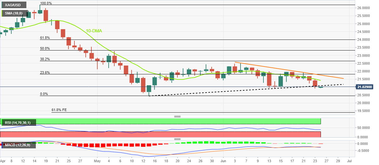 Silver (XAG/USD) regains $21.00 amid a corrective pullback near the weekly low. Even so, the bright metal keeps the downside break of the previous key support line during Friday’s Asian session.