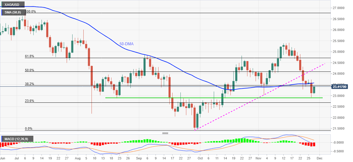 That said, the 38.2% Fibonacci retracement (Fibo.) level of July-September downside and 50-DMA, respectively around $23.50 and $23.60, limit the commodity’s rebound