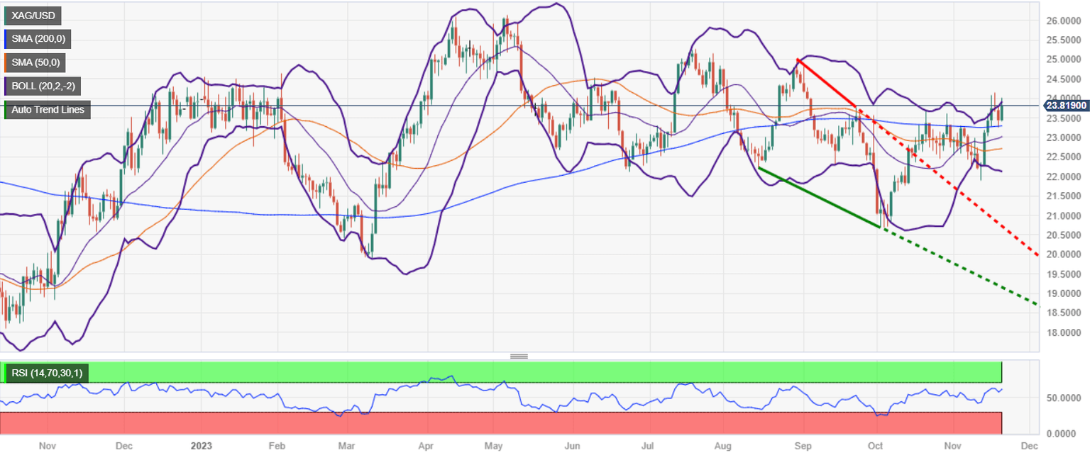 - XAG/USD maintains an upward bias, though it would require breaking above the November 17 high of $24.14 to solidify this trend.