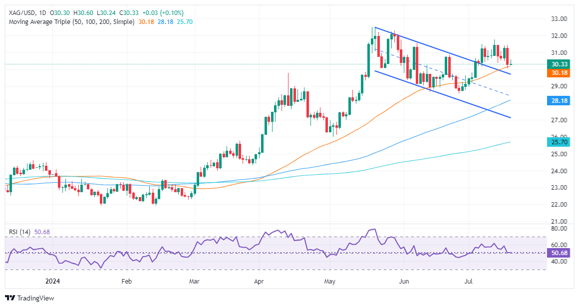 The grey metal remains bullish-biased, capped on the downside by the 50-day moving average (DMA) at $30.16. The Relative Strength Index (RSI) clings above the 50-neutral line, depicting that momentum favors buyers; hence, further upside is seen.