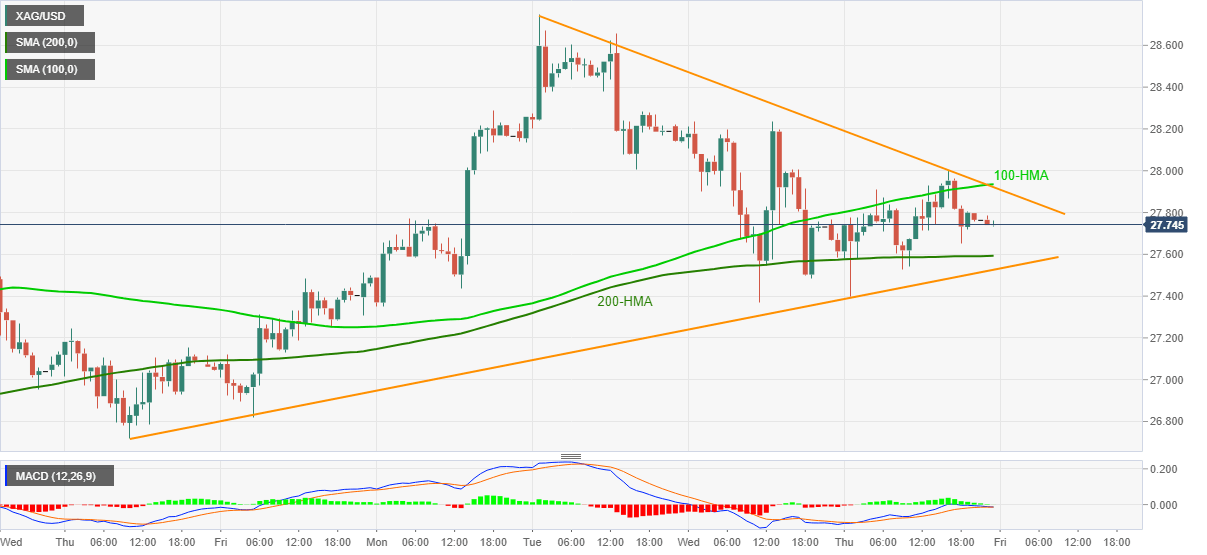 Silver seesaws around $27.70-75 during Friday’s Asian session. The white metal jumped to $28.00 the previous day before closing Thursday with minimal gains inside a one-week-old symmetrical triangle.