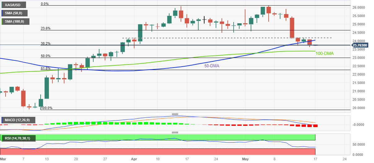 With this, the XAG/USD is well-set to drop test the 100-DMA support of near $23.40 before poking the 50% Fibonacci retracement level of its March-May upside, close to the $23.00 round figure.