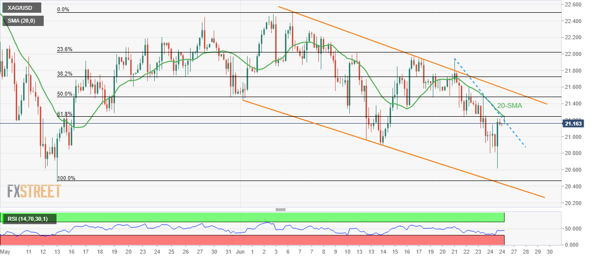 In doing so, the brighter metal pulls back from a convergence of the 61.8% Fibonacci retracement of May 13 to June 06 upside, as well as the 20-SMA, around $21.25.