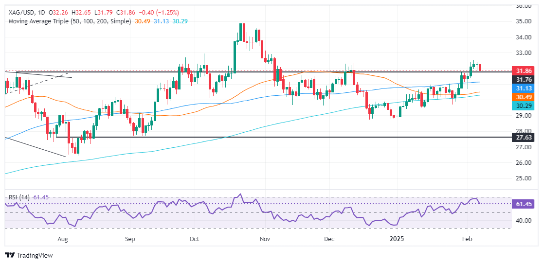 Silver Price Analysis: XAG/USD retreats from weekly highs, falls beneath $32.00
