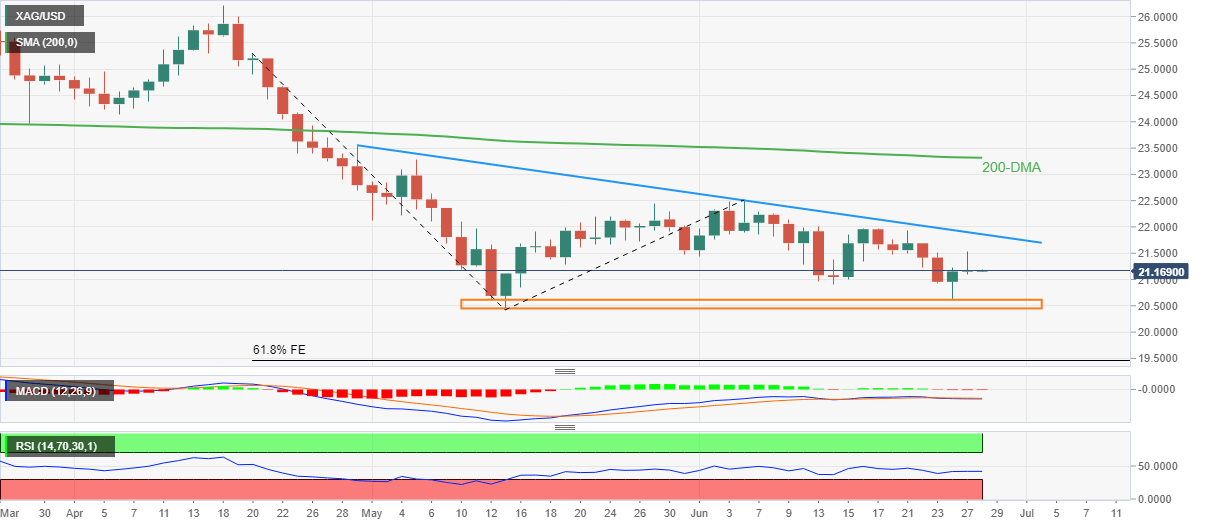 Silver (XAG/USD) prices remain pressured around $21.15, after reversing from $21.53 the previous day, as bears keep reins during Tuesday’s quiet Asian session.