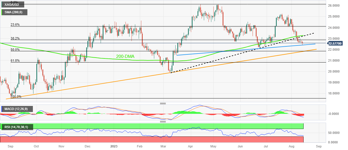 In doing so, the XAG/USD justifies the bearish MACD signals and a clear downside break of the $23.30 resistance confluence comprising the 200-DMA and previous support line stretched from March 10.