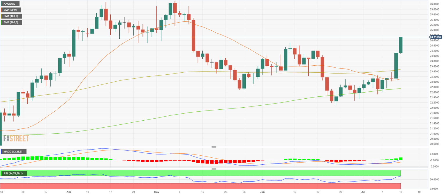 - The XAG/USD records more than 2% gains on the day, jumping to the $24.70 area.