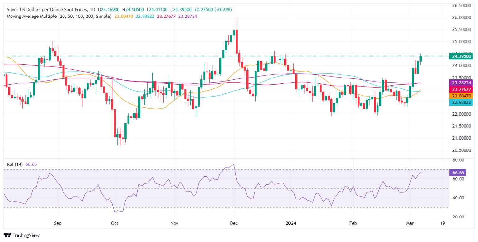 Silver price advances during Thursday’s session, gains almost 1% and stays above the $24.00 figure as investors expect a rate cut by the Federal Reserve in June. Therefore, XAG/USD exchanges hands at $24.40.