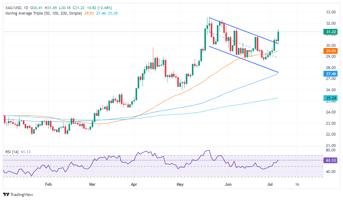 Silver soared above the June 20 high of $30.78 on Friday and extended its gains past the $31.00 figure following a weak US jobs report that lifted expectations about a possible Fed interest rate cut. Therefore, the XAG/USD climbed and traded at $31.20, a gain of 2.65%.
