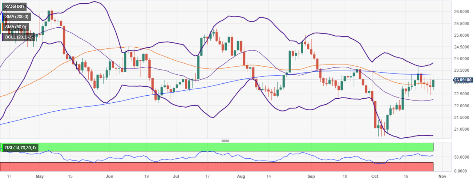 Conversely, if Silver tumbles below $23.00, that would keep the downtrend in place. The first support would be the 50-DMA at $22.94, followed by the October 26 low of $22.44, before tumbling to challenge the 20-day Exponential Moving Average (EMA) at $22.25.