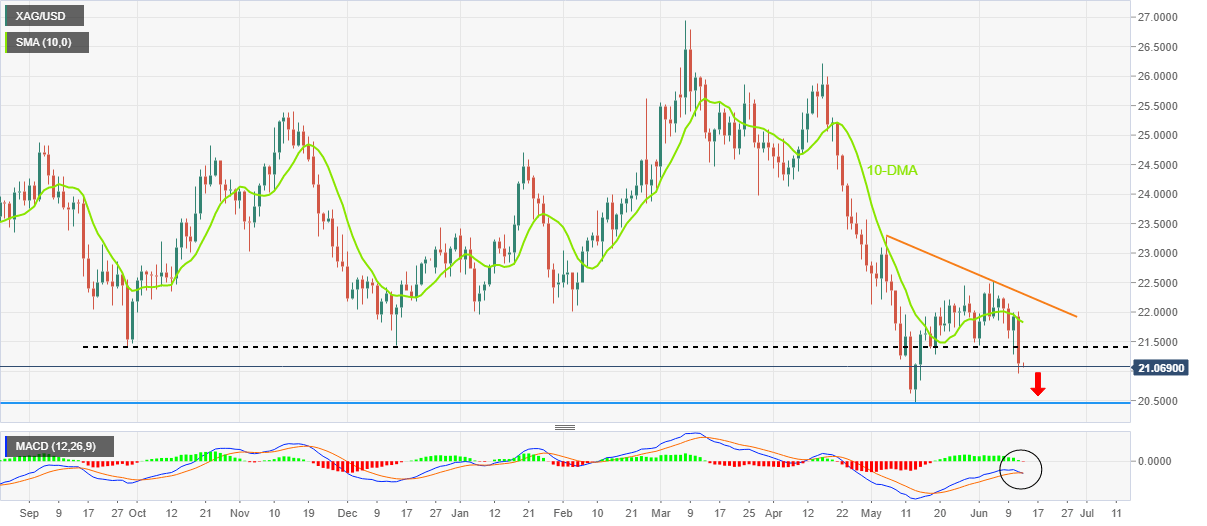 A clear downside break of the seven-month-old horizontal support, now resistance around $21.40, favors the XAG/USD bears. Also keeping sellers hopeful is the MACD line that teases a cross of the signal line from above, suggesting a downside momentum.