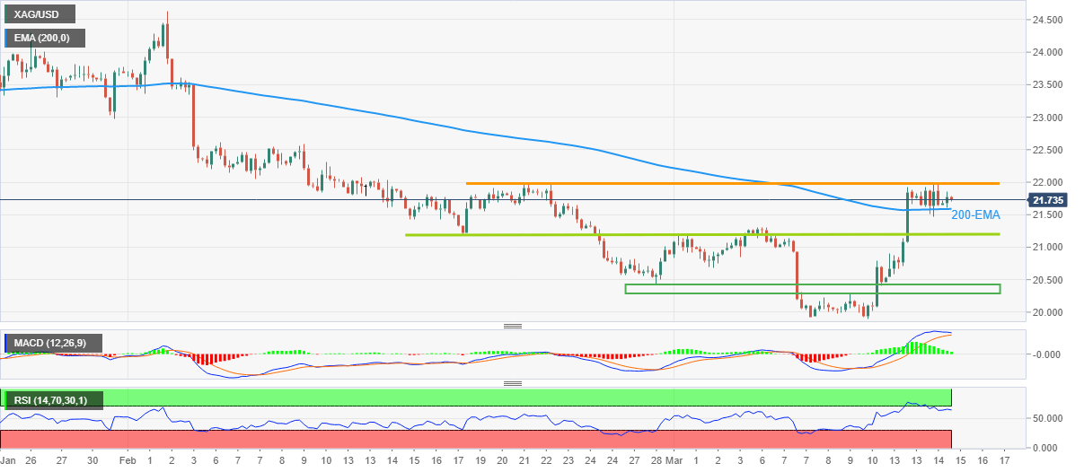 Silver Price Analysis: XAG/USD stays mildly bid within $0.40 trading range below $22.00