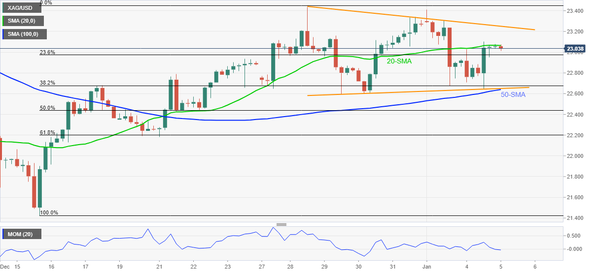 Alternatively, an upside clearance of the 20-SMA level of $23.06 will direct XAG/USD bulls towards the triangle’s resistance line of $23.25.