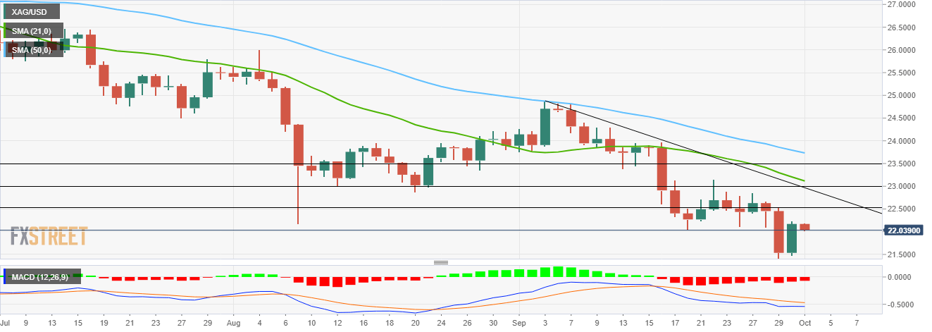 - XAG/USD remains pressured below the 21-day SMA since September 16.