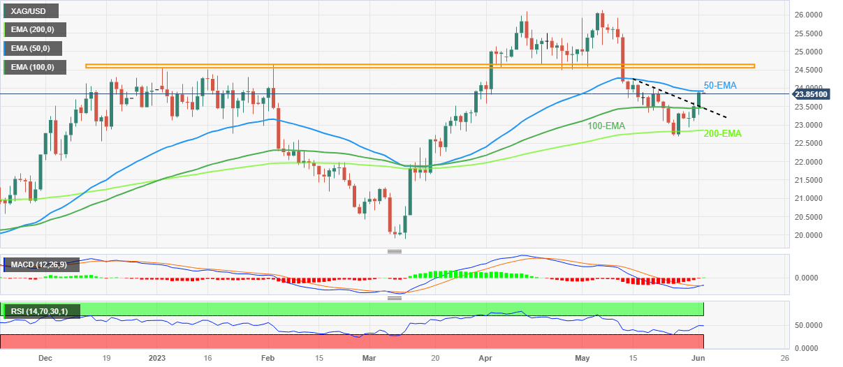Silver Price (XAG/USD) retreats from the weekly top of $23.92, mildly offered amid Friday’s Asian session, as the metal buyers jostle with the 50-day Exponential Moving Average (EMA) ahead of the key US jobs report for May.