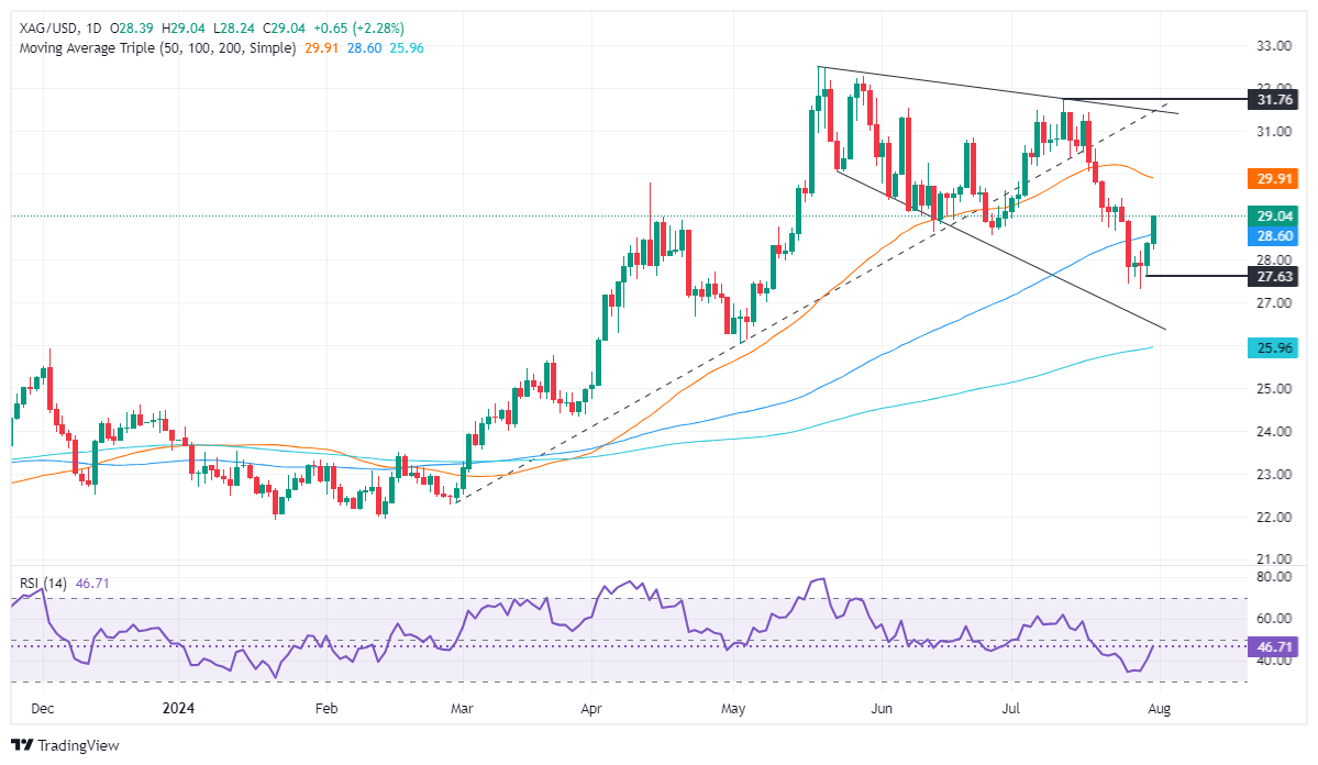 - XAG/USD clears the 100-DMA at $28.58; key resistance at $29.00 in focus.