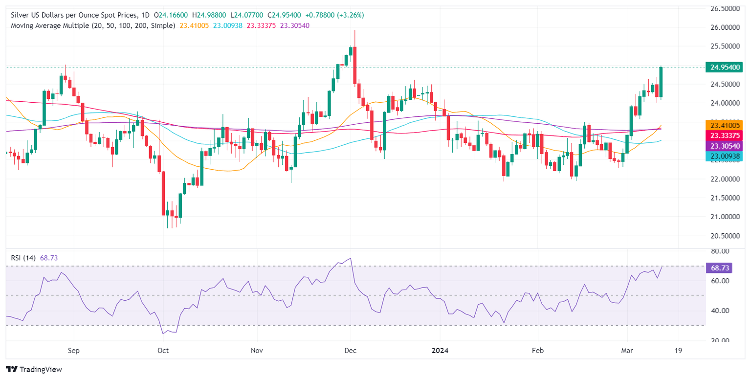 Silver rallied sharply in the mid-North American session on Wednesday, climbing more than 3.40% amid high US Treasury bond yields, while the Greenback extended its losses by more than 0.20%. At the time of writing, XAG/USD trades at $24.95, around new year-to-date (YTD) highs.