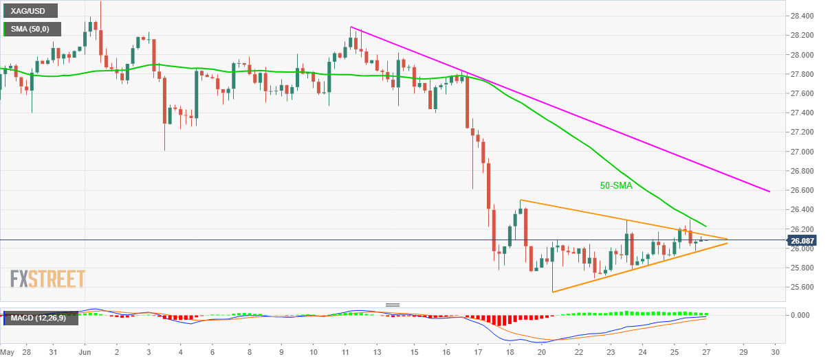 Silver takes a U-turn from intraday high to $26.10, up 0.08%, amid Monday’s Asian session. In doing so, the white metal remains inside a bearish pennant chart pattern while also justifying the U-turn from 50-SMA.
