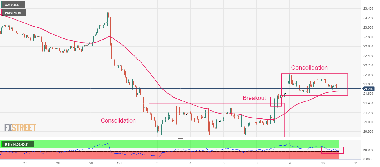 Silver price turns sideways in a range of $21.40-22.00 after an upside move. The precious metal got strengthened after a breakout of the consolidation formed in a range of $20.70-21.40. The 50-period Exponential Moving Average (EMA) at $21.66 is acting as a support for the Silver price bulls.