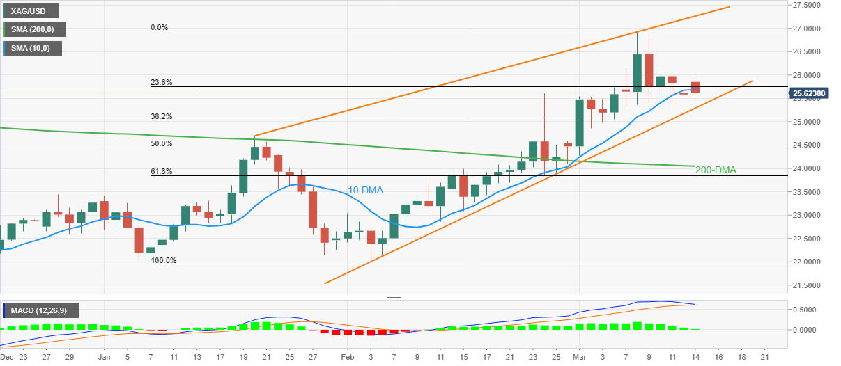 Silver (XAG/USD) prices remain on the back foot around $25.60 as bears attack the 10-DMA level during Monday’s mid-Asian session.