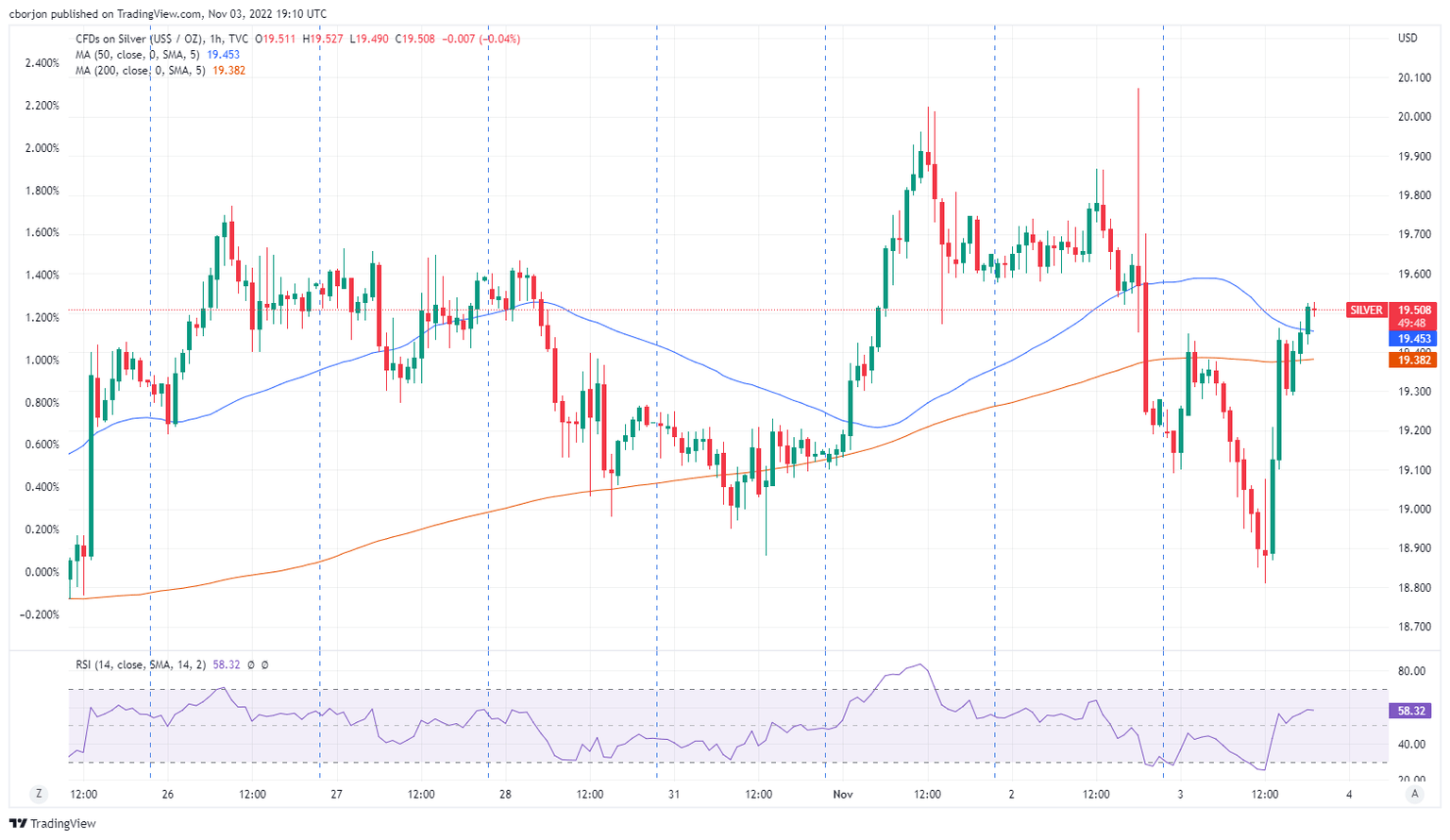Silver price recovered some ground on Thursday, even though the American Dollar is rising more than 0.70%, as shown by the US Dollar Index, underpinned by high US Treasury bond yields after the Federal Reserve raised rates by 75 bps. At the time of writing, the XAGUSD is trading at $19.50, above its opening price by 1.56%, after hitting a daily low of $18.84.