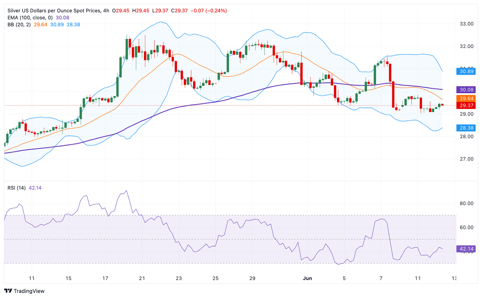 On the flip side, a low of June 11 at $29.04 acts as an initial support level for XAG/USD. Any follow-through selling below this level will see a drop to the lower limit of the Bollinger Band at $28.40. Further south, the next contention level is located at the $28.00 round figure.