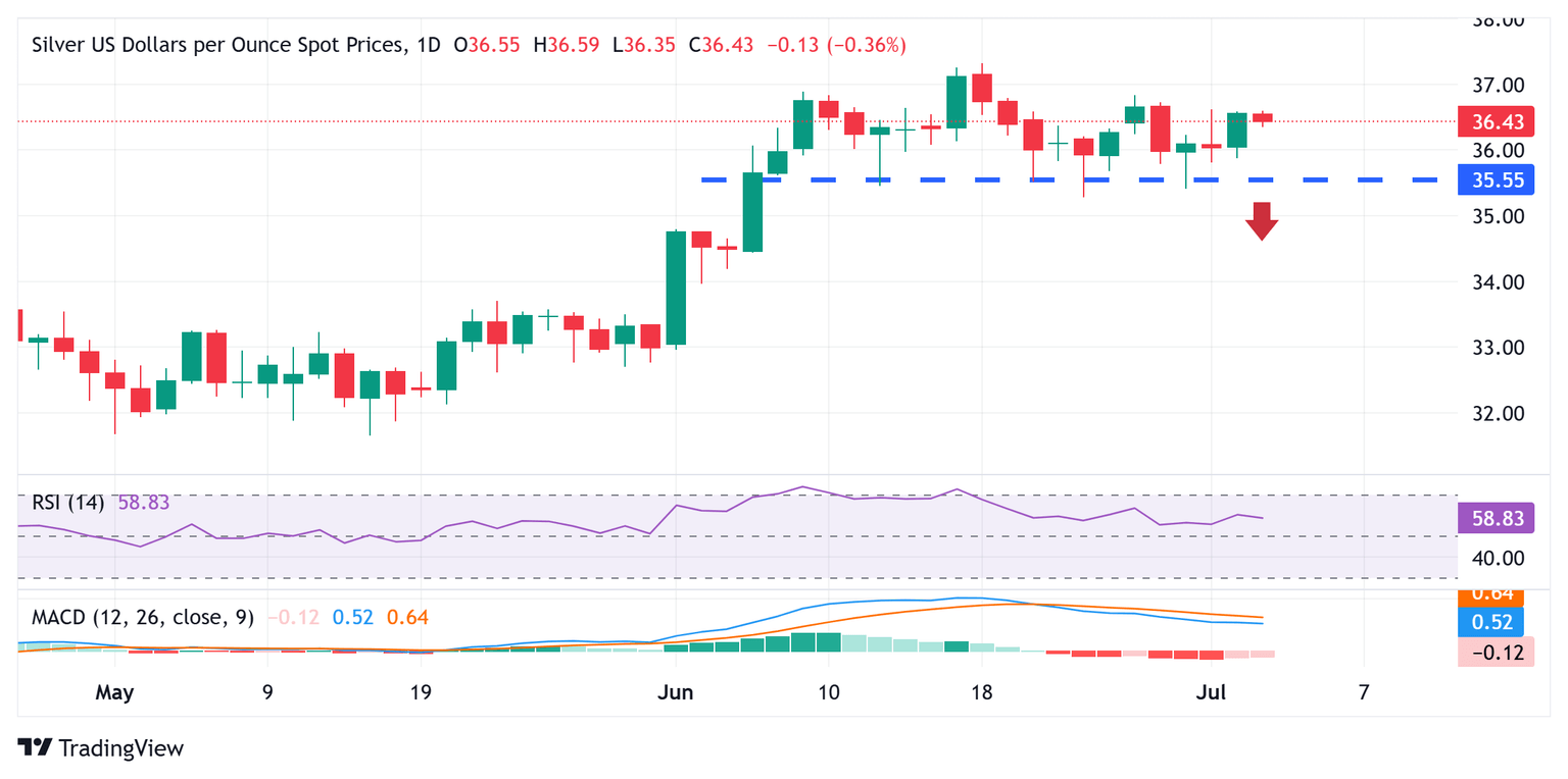 From a technical perspective, the Moving Average Convergence Divergence (MACD) histogram and the signal line on the daily chart have turned lower. However, the daily Relative Strength Index (RSI, 14) remains above 50, warranting some caution for the XAG/USD bears. Hence, any subsequent fall below the $36.00 mark might still be seen as a buying opportunity and remain limited near the $35.50-$35.40 horizontal support.