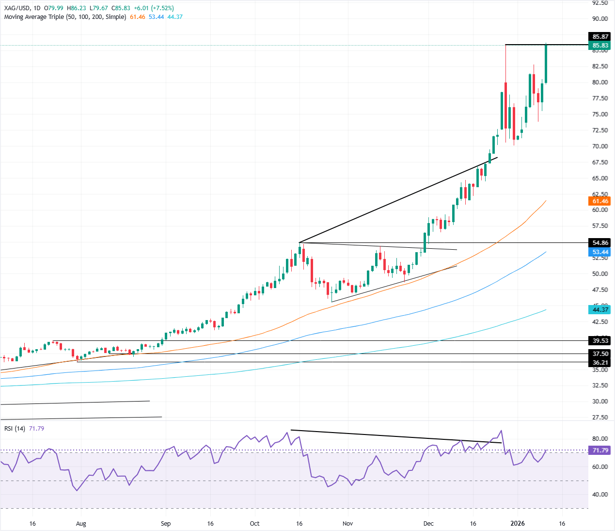 Silver (XAG/USD) rally extends for the second straight day on Monday, with buyers pushing prices to a new record high of $86.23 a troy ounce, posting daily gains of nearly 7.50%, courtesy of the US Department of Justice, which has indicted the Federal Reserve (Fed) Chair Jerome Powell, over the renovations of the Fed’s buildings. At the time of writing, XAG/USD trades at $85.90.