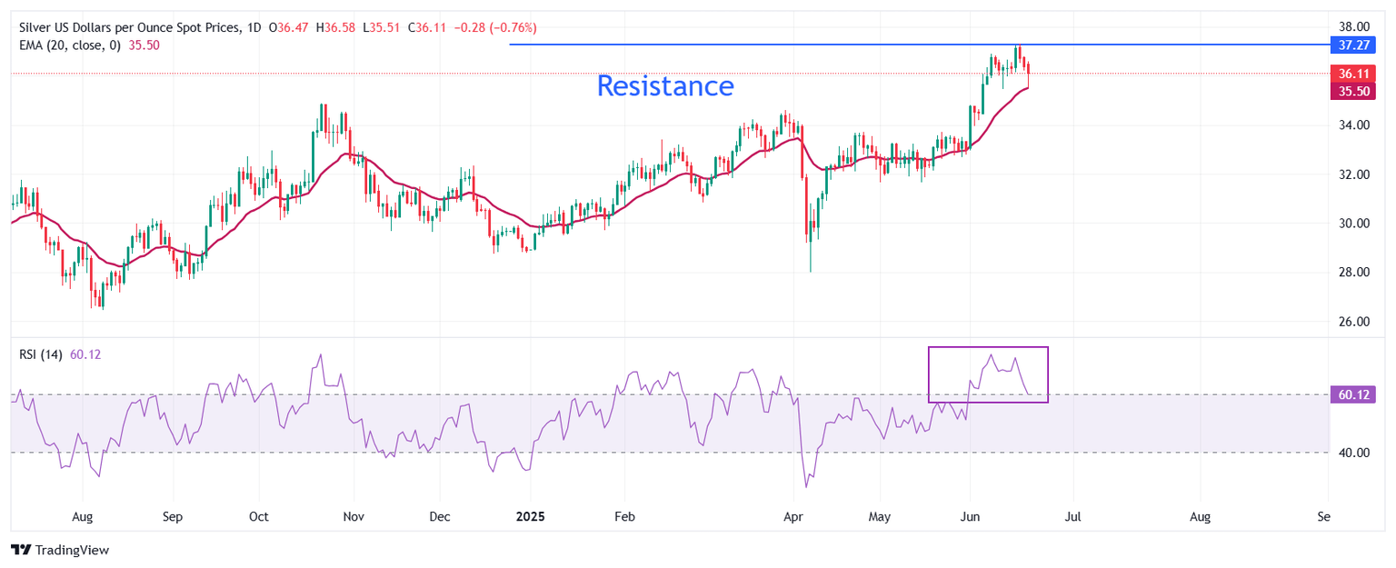 Silver price (XAG/USD) claws back half of its early losses and rebounds to near $36.10 during the European trading session on Friday. The white metal attracted bids after revisiting the two-week low around $35.50 as tensions in the Middle East remain intact amid the aerial war between Israel and Iran.