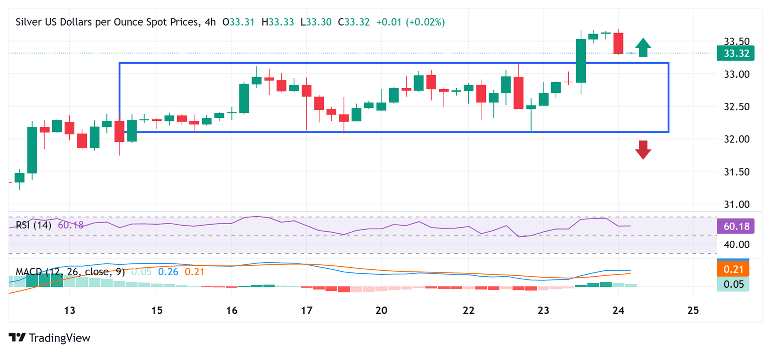 Silver (XAG/USD) attracts some sellers after hitting a nearly three-week top near the $33.70 region during the Asian session on Thursday and erodes a part of the previous day's strong move up. The white metal currently trades around the $33.35-$33.30 area, down 0.75% for the day, though the technical setup supports prospects for the emergence of dip-buyers at lower levels.