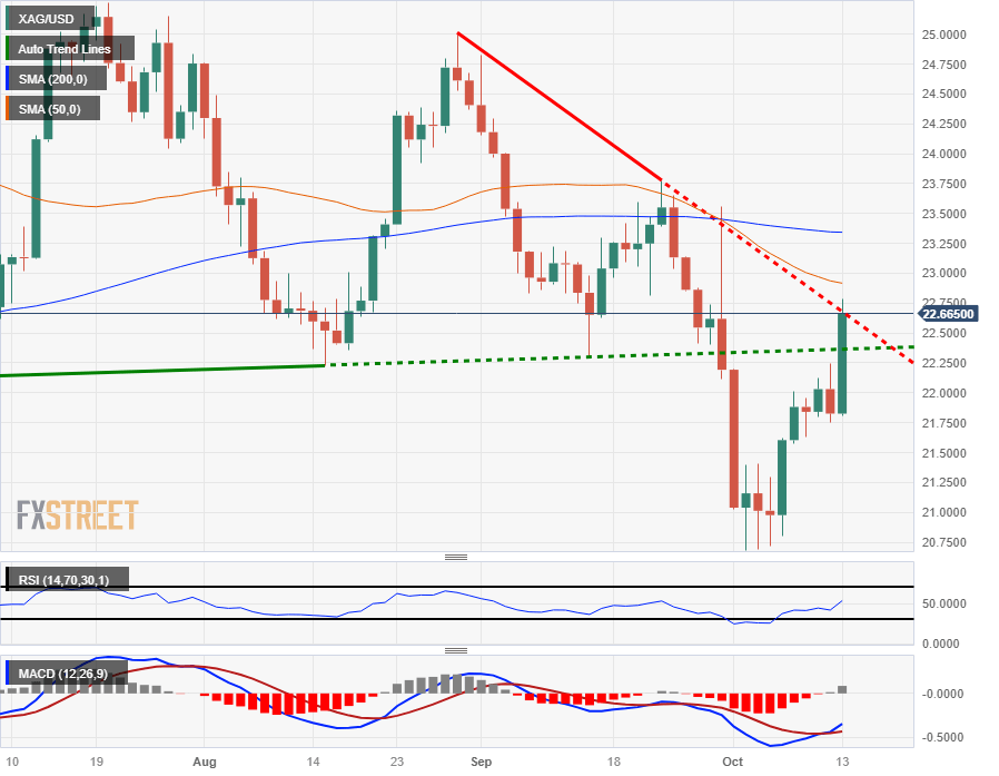 Friday's firm bid for spot Silver prices sends the XAG/USD pinning directly into a descending trendline from late-August's swing high into the $25.00 handle, while the 50-day Simple Moving Average (SMA) sits just overhead current price action near $22.90.