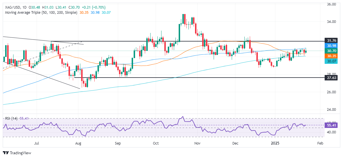 Silver price recovers some ground and trades with gains of 0.91% yet it has failed to clear key resistance at the 100-day Simple Moving Average (SMA) at $30.95. At the time of writing, XAG/USD trades at $30.70 after bouncing off a low of $30.36.