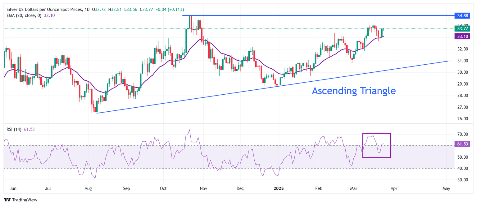 Silver price (XAG/USD) holds onto gains near $33.80 in European trading hours on Wednesday. The white metal shows resilience as market participants are cautious over the United States (US) economic outlook under the leadership of President Donald Trump.