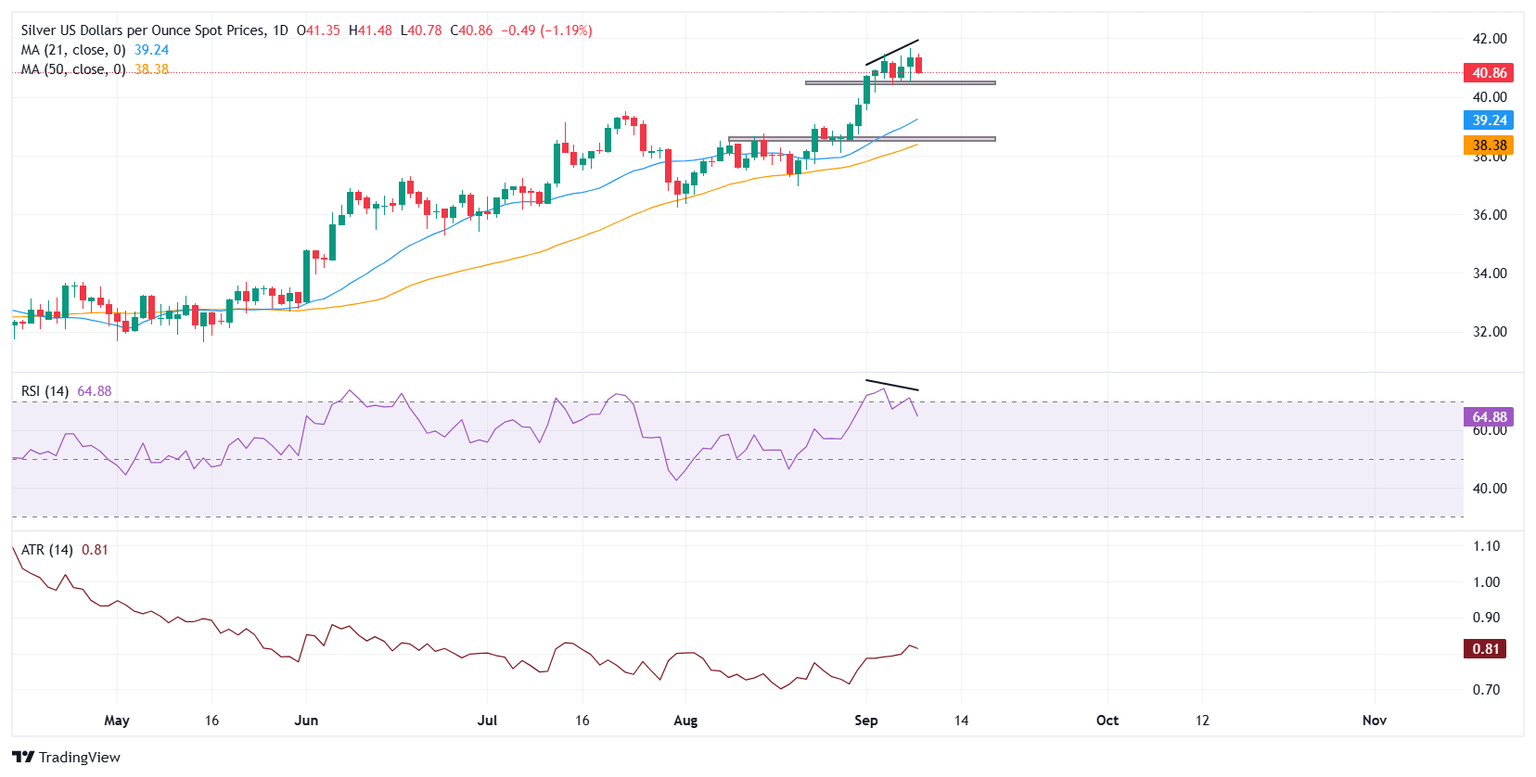The white metal has been trapped in a tight band between $41.50 and $40.50 since last week, after hitting a fresh 14-year peak around $41.67 on Monday. While the pullback reflects profit-taking and short-term USD strength, the downside remains limited as markets are almost fully convinced that the Federal Reserve (Fed) will lower interest rates at its September 17 monetary policy meeting. Lower borrowing costs reduce the opportunity cost of holding non-yielding assets such as Silver, keeping the broader bullish tone intact.