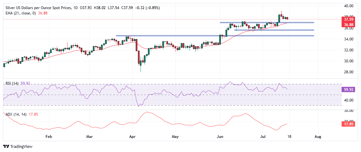 On the technical front, Silver remains in an established uptrend, with the price holding firmly above the 21-day Exponential Moving Average (EMA), currently at $36.91. This moving average continues to act as dynamic support, reinforcing the short-term bullish bias. However, the metal has stalled just below the key resistance zone near $39.00-$39.13, where sellers emerged and capped upside attempts.